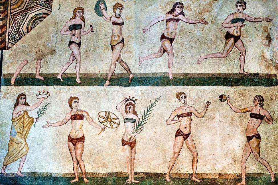 One of the most important and very rare iconographic testimonies of female athletes in antiquity dates back to the fourth century AD: they are the nine beautiful girls in dazzling and extraordinarily modern form that we admire in the mosaic of the Palestrite room, one of the rooms of the Roman villa of Casale in the near Piazza Armerina in Sicily, famous all over the world for the garment they wear, considered the first bikini in history. Two girls play with the ball, one seems to be engaged in throwing the discus, a sport usually reserved for men, while another seems intent on lifting weights.